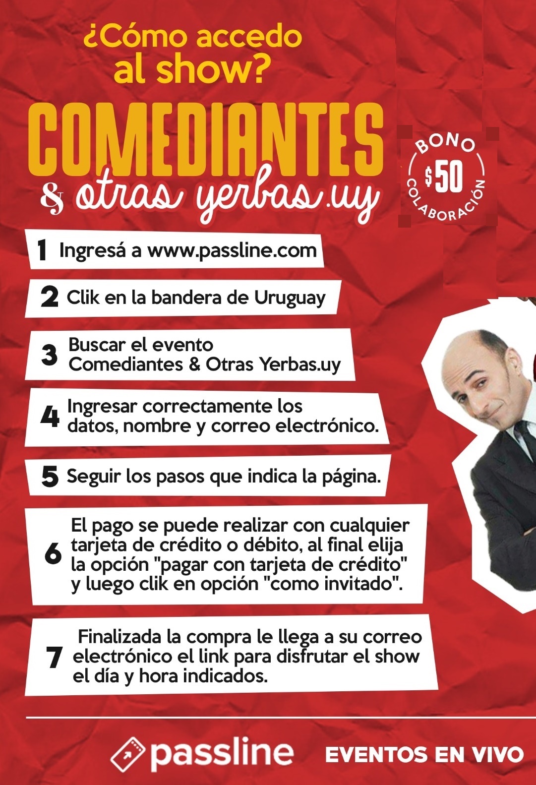 Ingresan a la web: www.passline.com y a continuación se pincha la bandera de Uruguay, ya dentro de la página hay que buscar el evento COMEDIANTES & OTRAS YERBAS, se pincha el mismo y a partir de ahí la página los va guiando de una forma muy sencilla. De esta manera pueden colaborar con $ 50, $ 150 o lo que prefieran, ya que también tienen esa posibilidad.